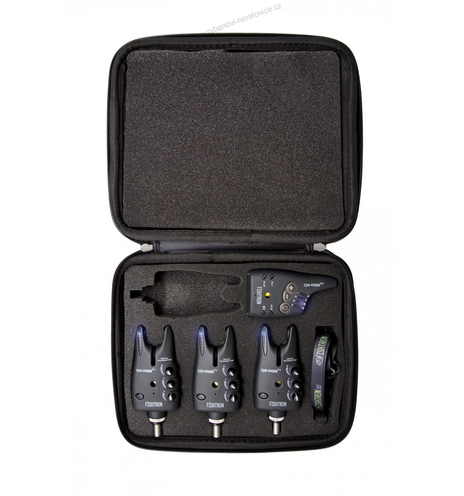 - Signalizátorů Q9-RGB-TX (3ks.) - vyniká množstvím nepostradatelných funkcí, jako je multifunkční unikátní optická a akustická signalizace směru potahu vlasce, široká možnost nastavení citlivosti od 4 mm do 15cm, velké spektrum volby tónu a hlasitosti, intuitivní regulace citlivosti, tónu a hlasitosti. Nechybí ani funkce MUTE, pro vypnutí vysílacího modulu a zvuků na dobu 60s. Tuto funkci oceníte při nastavování swingeru.