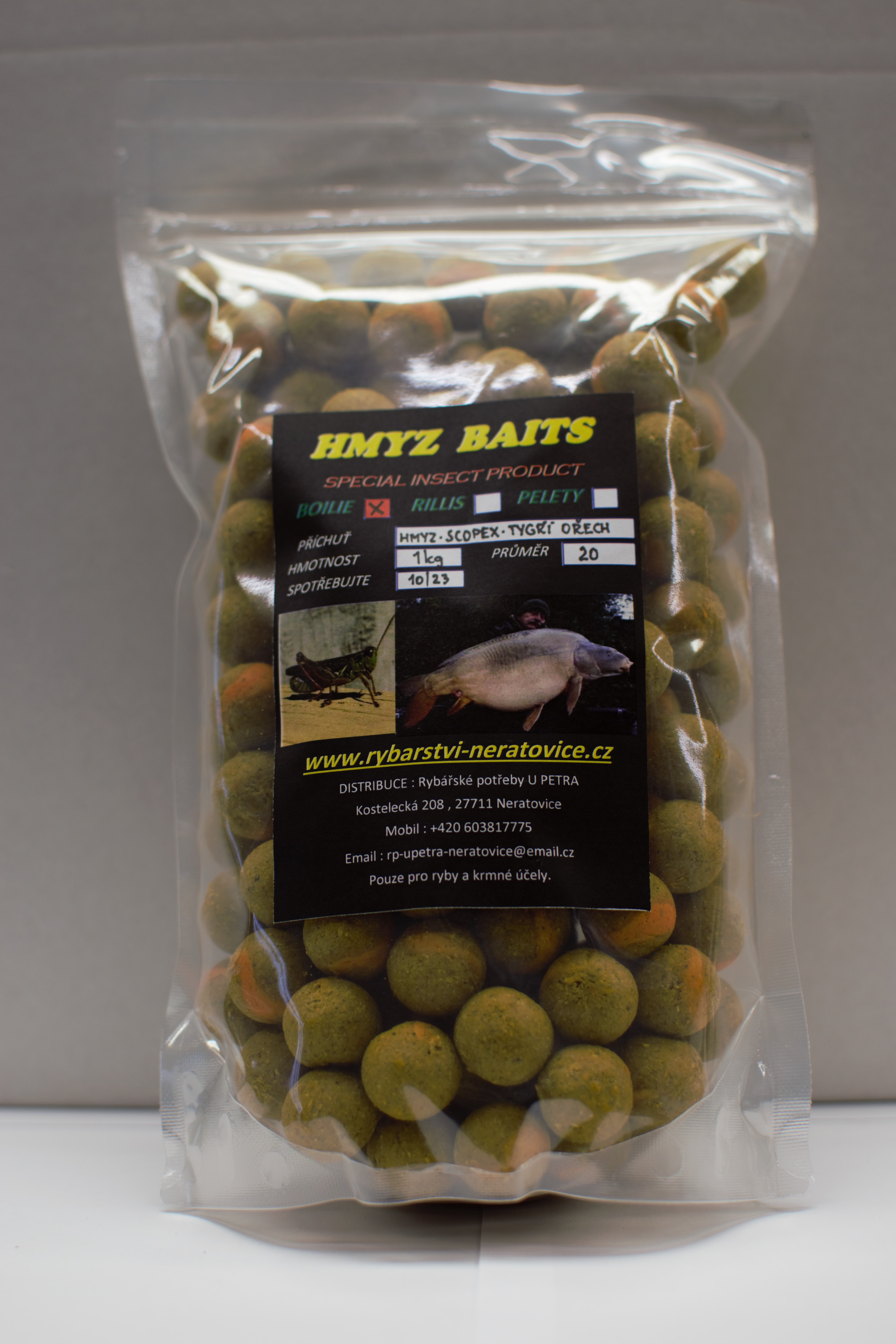 Díky velkému zájmu rybářů Vám přinášíme nový produkt, a to Boilie na bázi Hmyzu - Scopex/Tygří ořech ve 20mm.