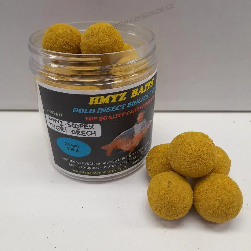 Gold Insect boilies v Powder dipu - Hmyz/Scopex/Tygří ořech - 150g - 24mm