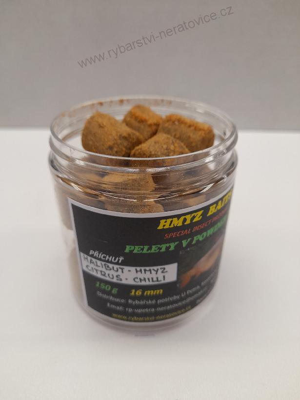 Pelety chytací v Powder Dipu - Halibut - Hmyz/Citrus/Chilli - 16mm - 150g