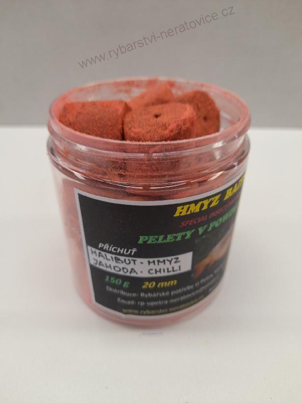 Pelety chytací v Powder Dipu - Halibut - Hmyz/Jahoda/Chilli - 20mm - 150gSkladem v eshopu125 Kč/ ks112 Kč bez DPH