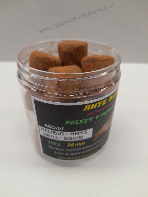 Pelety chytací v Powder Dipu - Halibut - Hmyz/Krill/Squid - 20mm - 150g