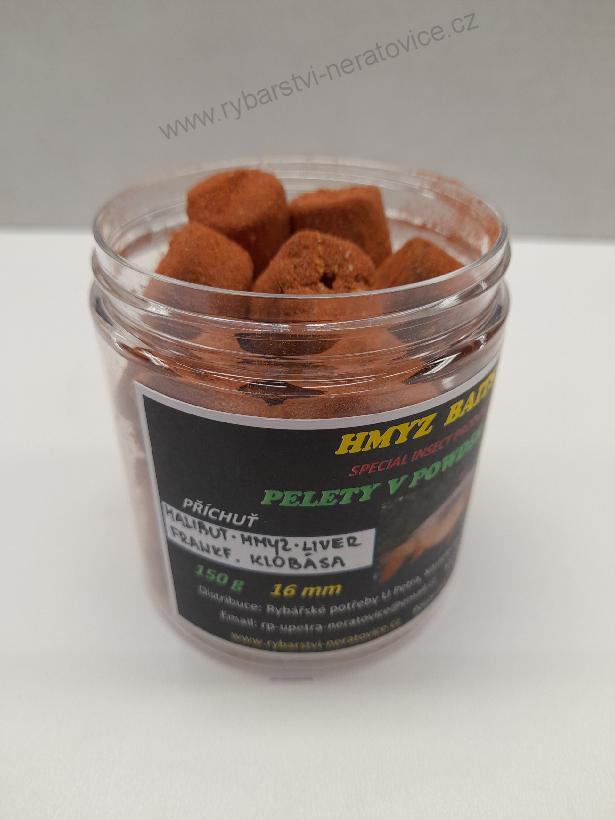 Pelety chytací v Powder Dipu - Halibut - Hmyz/Liver/Frankfurtská klobása - 16mm - 150gSkladem v eshopu125 Kč/ ks112 Kč bez DPH