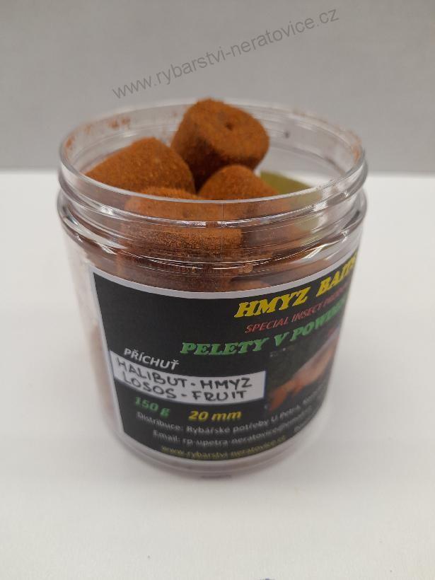 Pelety chytací v Powder Dipu - Halibut - Hmyz/Losos/Fruit - 20mm - 150gSkladem v eshopu125 Kč/ ks112 Kč bez DPH
