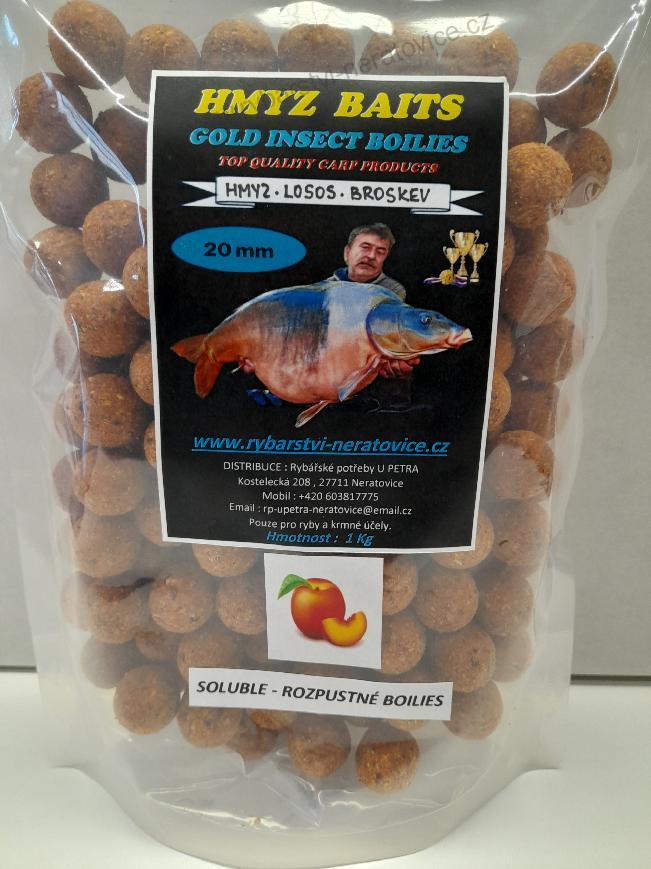 Soluble - rozpustné boilie - Hmyz/Losos/Broskev - 20mm - 1kgSkladem v eshopu260 Kč/ ks232 Kč bez DPH